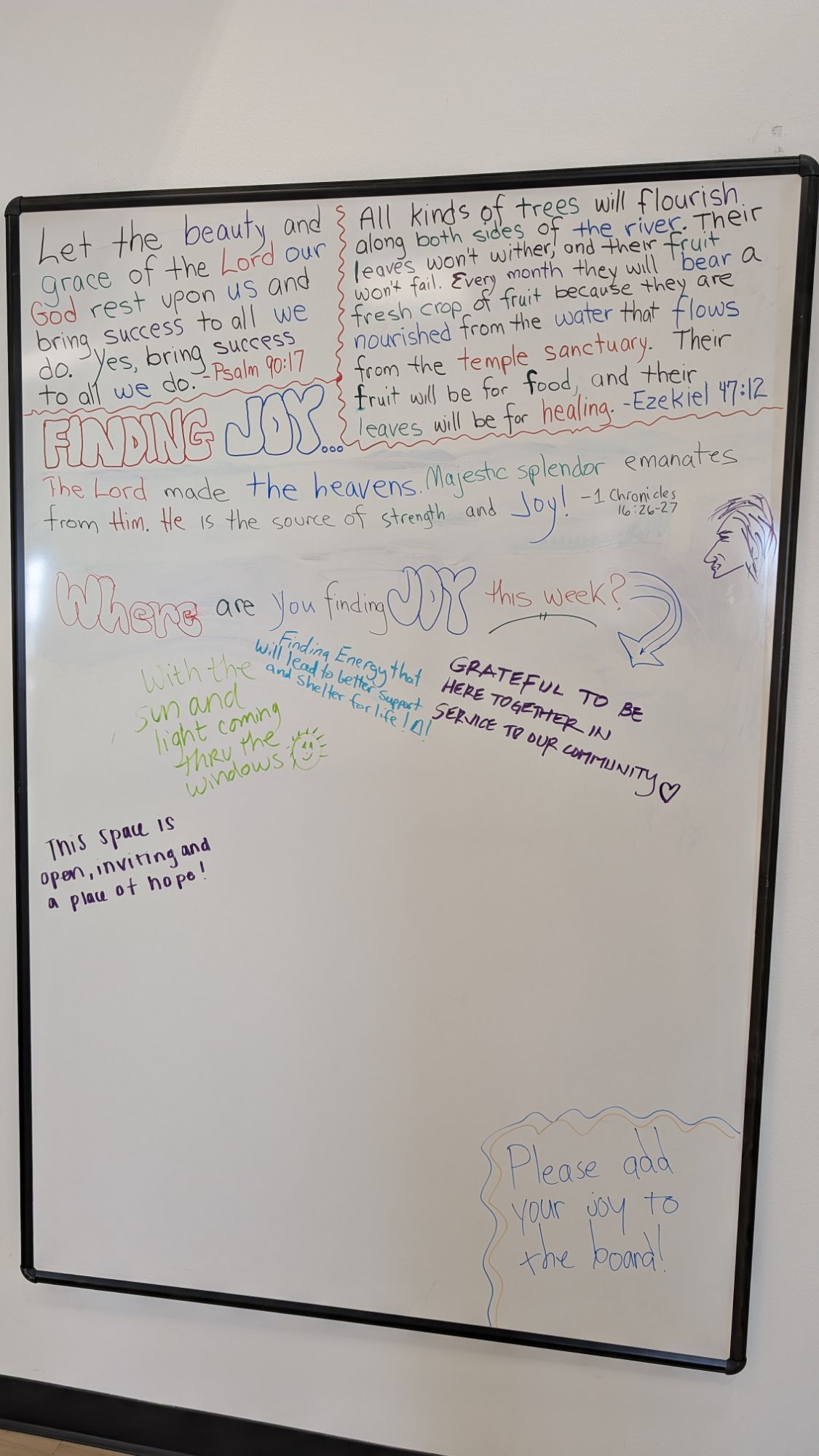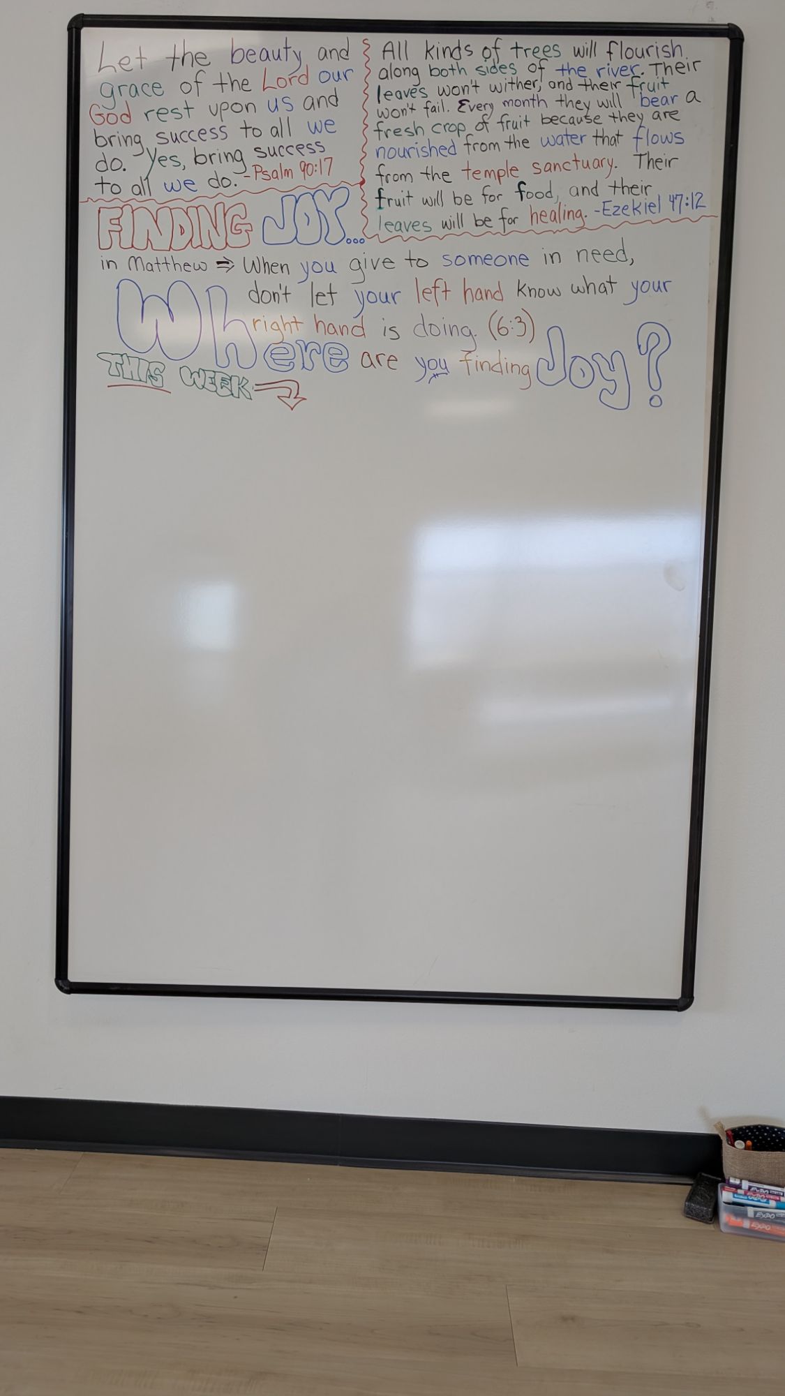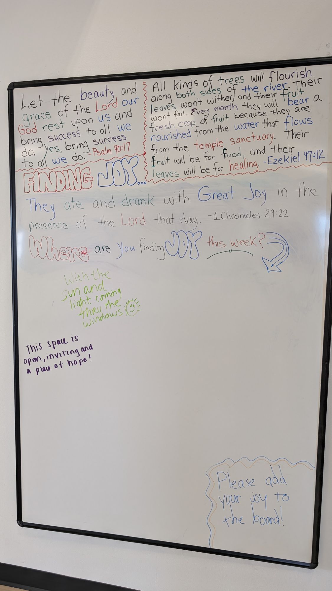 The River just opened in their NEW location (across the street from their original location). Wow, what a dream come true! God has surely blessed the River and granted the River much Favor! And when you walk into the new building you will be greeted by a wonderful entry area … and in place of the original blackboard, there now is a much larger Whiteboard! The two original Scriptures (from twenty years ago when The River started) remain at the two top corners… followed by a Scripture of the week. The weekly Scriptures will be aligned with FINDING JOY! Here is how it looks at the very beginning: